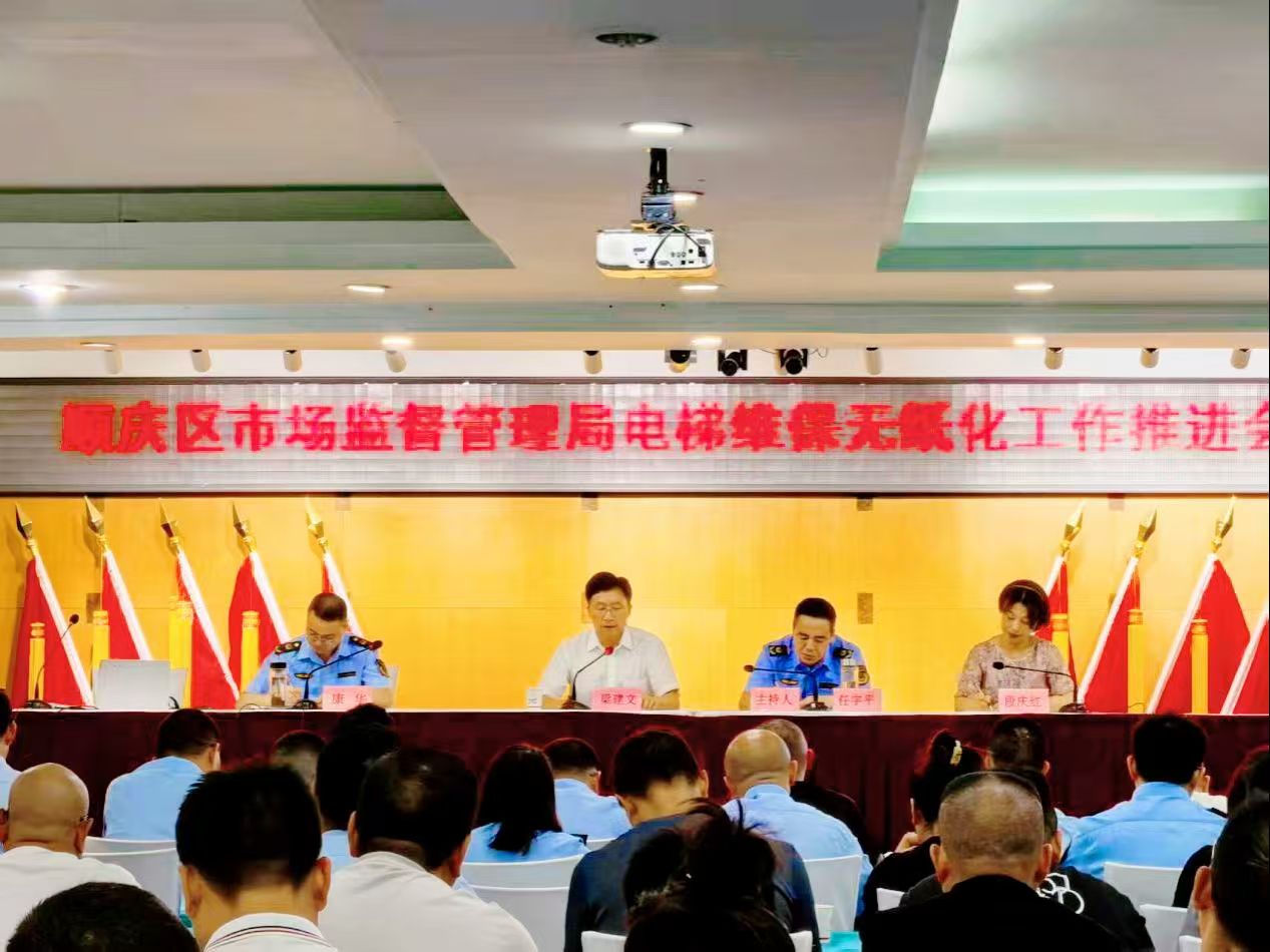 (金鑫.张杨柳) 为规范电梯维保工作、提高维保质量,8月28日,南充市顺庆区市场监督管理局召开电梯维保无纸化工作推进会。南充市市场监督管理局党组成员、副局长梁建文出席,监管人员、维保单位负责人、部分电梯使用单位安全总监和安全员等140人参会,顺庆区市场监管局党组书记、局长任宇平主持会议。