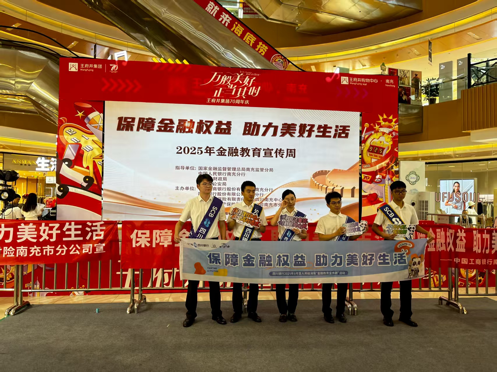 (金鑫.樊正太文/图) 为全面贯彻落实党的二十大和二十届二中、三中全会精神以及中央经济工作会议、中央金融工作会议部署,深入践行金融工作政治性、人民性,持续提升公众金融素养和风险防范能力,维护金融消费者和投资者合法权益,9月17日下午,由国家金融监督管理总局南充监管分局,中国人民银行南充分行,南充市财政局,南充市公安局指导,中国工商银行股份有限公司南充分行,四川银行股份有限公司南充分行,泰康人寿保险有限责任公司四川南充中心支公司,中国人民财产保险股份有限公司南充市分公司等多家机构联合主办的2025年“保障金融权益.助力美好生活”的金融教育宣传周在南充高坪王府井购物大厅隆重啓幕。