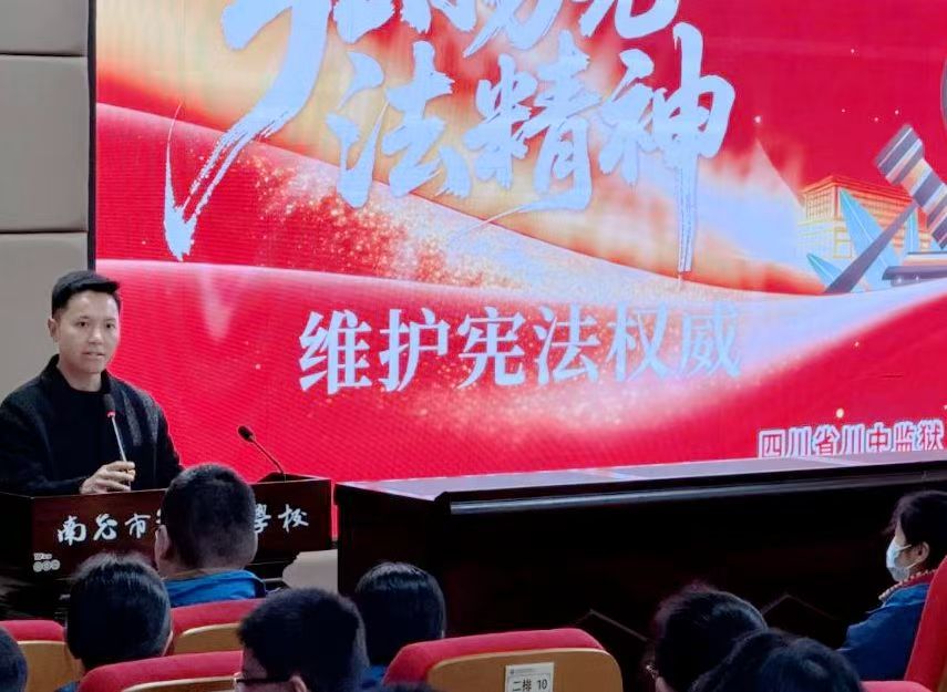 本网讯:(金鑫.樊正太) 为深入贯彻落实宪法精神,增强青少年法治意识与自我保护能力,引导学生树立正确权利义务观念,近日,南充五中育英校区特别邀请四川省川中监狱民警、律师蔡静同志等一行人到校开展普法宣传教育活动。本次活动由学校德育安全处主任文雄主持,蔡静同志以专业法律视角、生动案例解析,搭配精准宣传物料分发,为同学们带来一堂干货满满的“沉浸式” 宪法公开课。