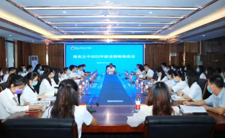 (金鑫.粟泫瑜) 聚力新学期,奋进新征程。为助力新教师尽快适应新角色,融入新环境,9月23日,南充五中2022年新进教师座谈会在青龙山校区经纬楼三楼会议室举行,南充五中全体校级干部、部分行政干部及42位新进教师参会,会议由青龙山校区副校长宋岩主持。