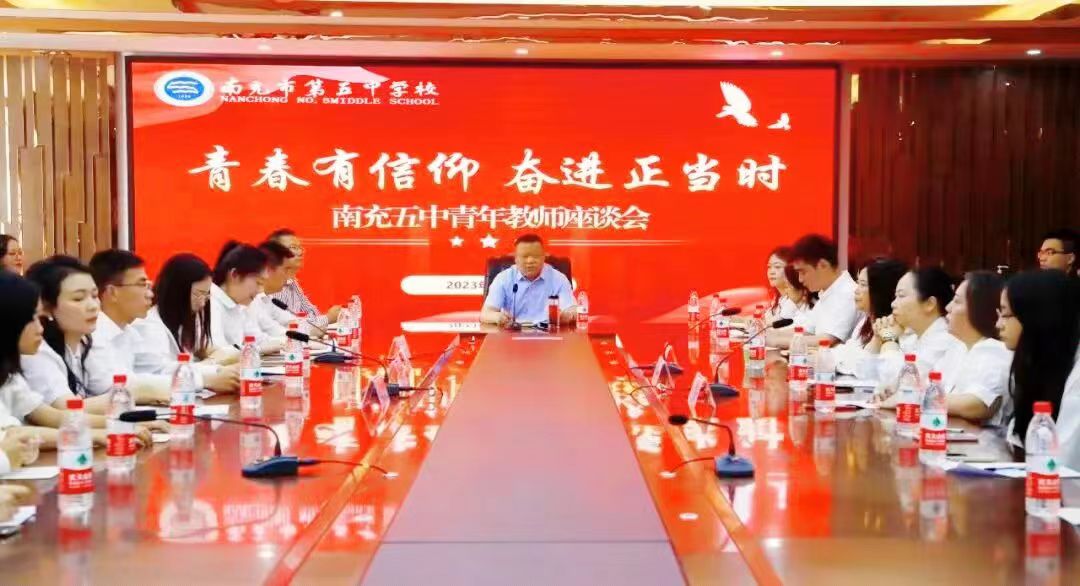 (金鑫.王攀) 为进一步弘扬“五四” 精神,加强青年教师思想建设,增进青年教师间的沟通交流,积极营造学习先进、争当先进的氛围,5月11日下午,南充五中在青龙山校区召开了以“青春有信仰 奋进正当时”为主题的青年教师座谈会。南充五中党总支书记、校长韦晗,校级领导、党总支委员以及三校区青年教师代表参加了座谈。座谈会由团委副书记赵洋阳主持。