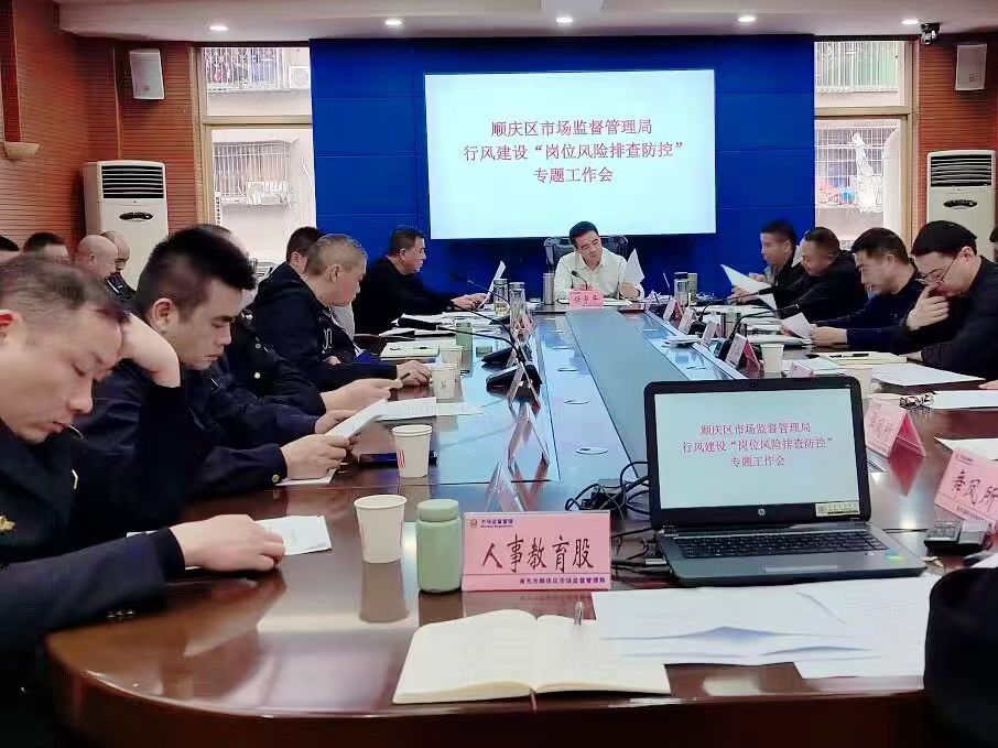 (金鑫.任洋.樊正太) 为进一步加强市场监督管理局的行风建设,确保各项工作的规范性和高效性,顺庆区市监局于近日召开了行风建设岗位风险排查防控专题工作会,会议由党组书记、局长任宇平同志主持,局班子成员、各股室队所负责人参加。