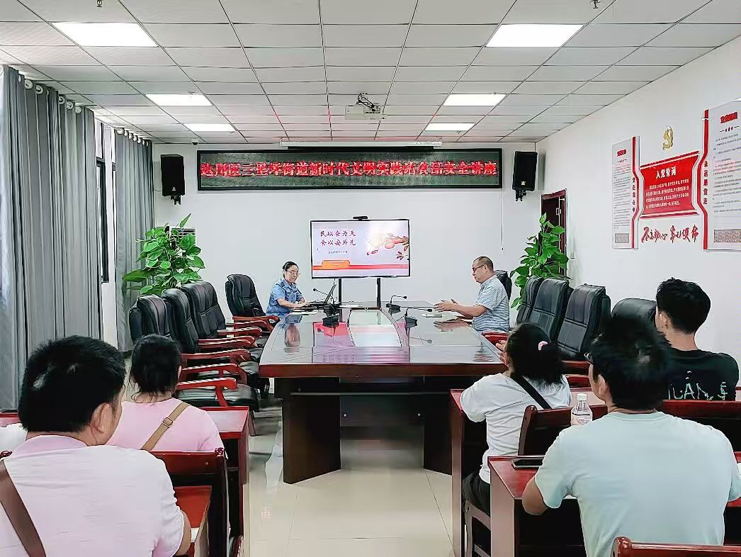 (金鑫.刘伟.王燕.何勇) 9月19日14:30,达州市达川区三里坪街道的30名食品小摊小贩业主齐聚三里坪街道7楼会议室,聆听由区市场监管局与街道办联合举办的达川区三里坪街道新时代文明实践站食品安全知识讲座。讲座由区市场监管局协调应急股股长王燕主讲,旨在有效提升参会人员的食品安全意识和法律素养。