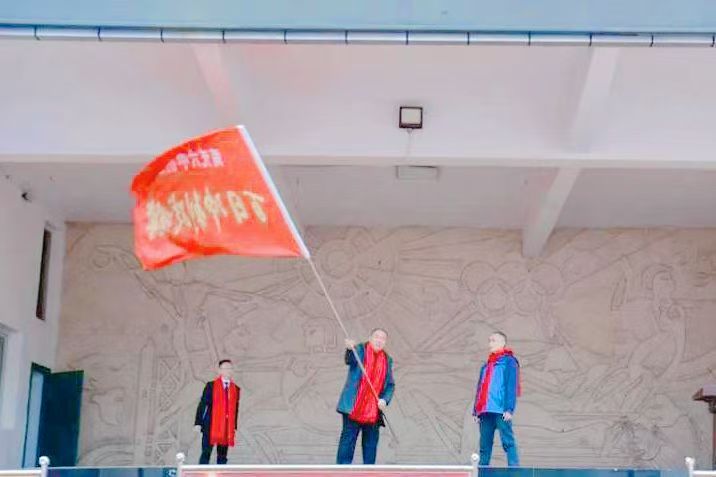 授旗仪式上,学校党委书记罗斌为高三年级授予“高考必胜”战旗,党委副书记、副校长田德明(主持行政工作)为初三年级授予“中考夺魁”战旗。