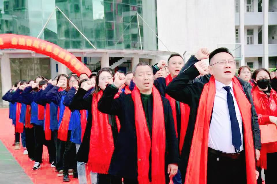 随后,全体毕业班师生庄严宣誓。教师代表赵广文领誓:“恪尽职守,精准备考;甘为人梯,倾尽全力!”学生代表则高声承诺:“百日拼搏,不负韶华;迎战中考(高考),誓攀高峰!”铿锵誓言响彻云霄,彰显了师生共赴征程的决心。